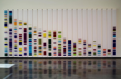 Chromosome Painting II is the result of a two-year collaboration with researchers in the University of Washington’s department of medical genetics. The work is inspired by synteny maps, or genetic linkage maps, which compare gene sequences between species in order to better understand the evolution of chromosomes. Each of the long, colorful silk panels are printed with human chromosome maps, representing diseases that correlate to a specific genetic marker.