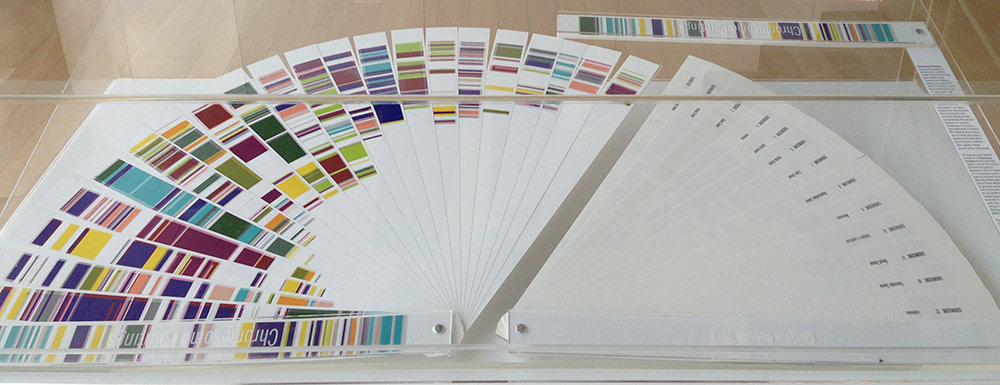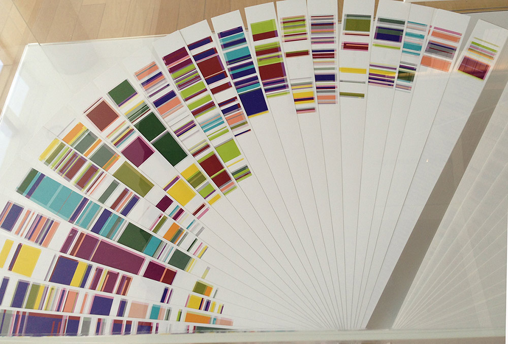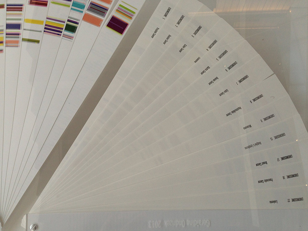 Chromosome Paintings Book is based on the image of a synteny map, a colorful, striped array that compares gene sequences and chromosomes between species. The technique of chromosome painting, also known as “fluorescence in situ hybridization” can detect chromosomal abnormalities like translocations and structural alterations that are associated with various diseases. For example, chromosome 19 carries a gene implicated in leukemia. With these disease associations in mind, each page is letterpress printed with the type of cancer correlated with a genetic marker present on the chromosome. The book is based on a pantone color sample book commonly used by artist.