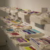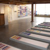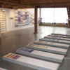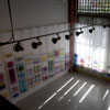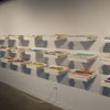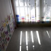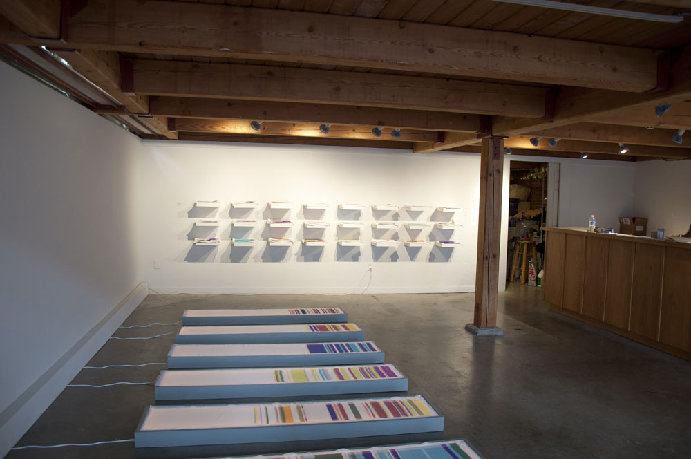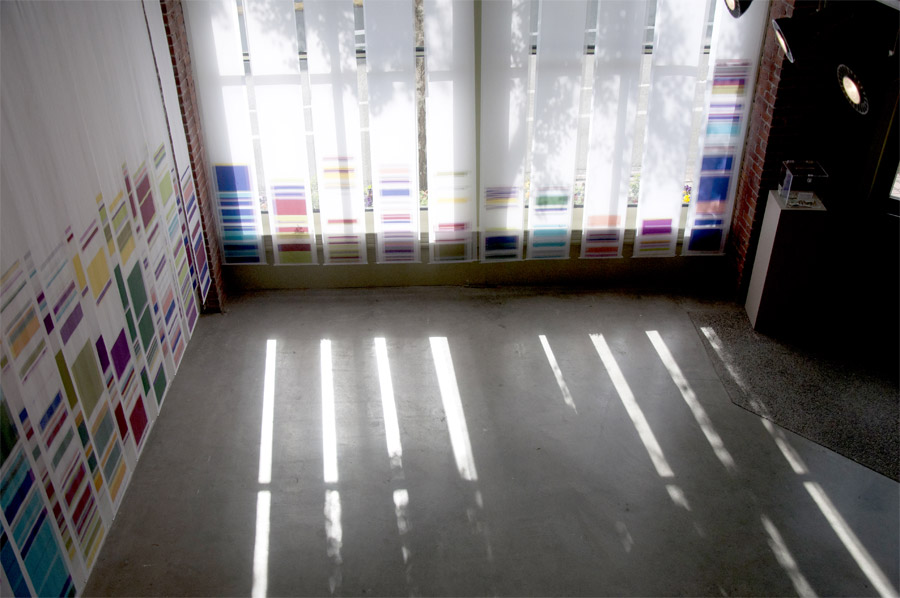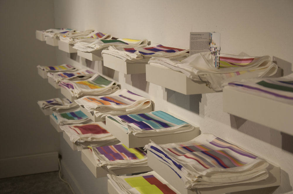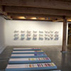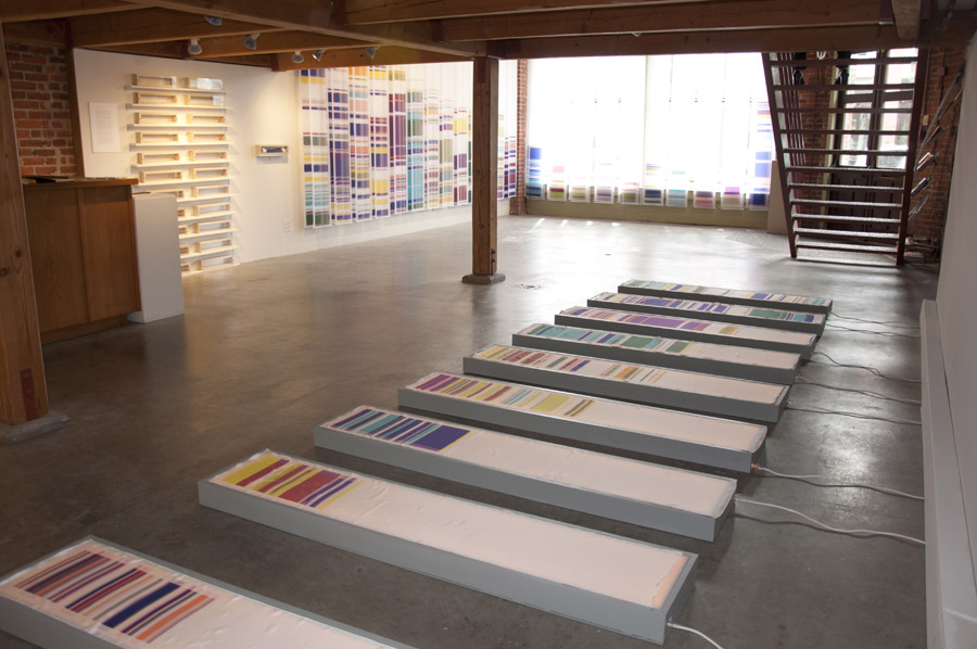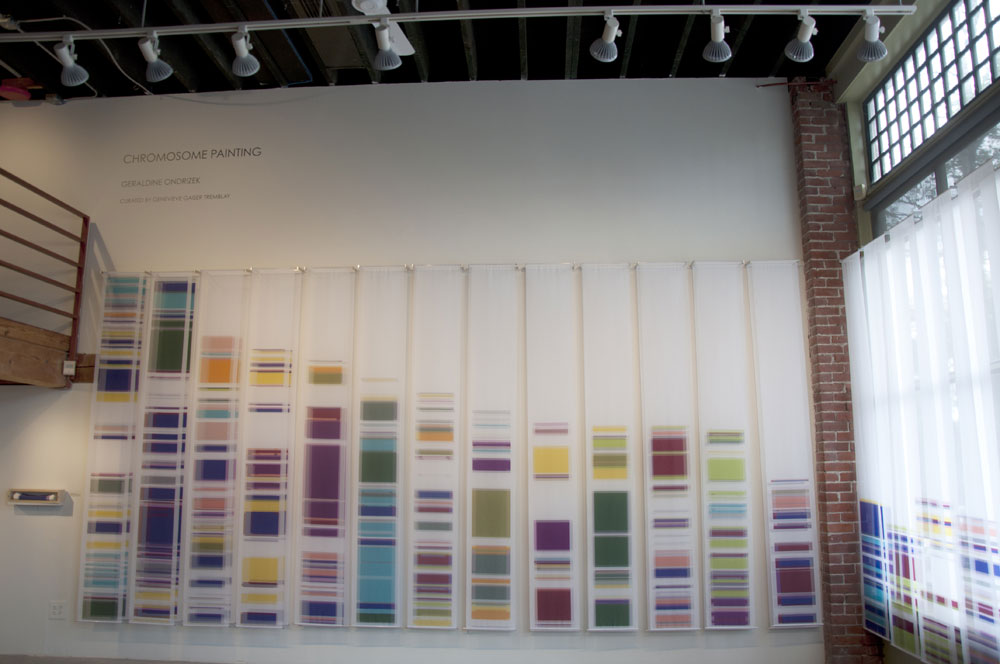 The third body of work, Chromosome Paintings, which spans the front window and wall, was made specifically for the Kirkland Arts Center. Chromosome Paintings is based on the image of a synteny map, a colorful, striped array that compares gene sequences and chromosomes among species. The long silk panels, each printed with human chromosome maps, are arresting displays of fluorescent color arranged to stunningly depict chromosomal comparisons. Fuchsia neighbors chartreuse, purple sidles up to orange, soft grays mingle with blues. These juxtapositions spur the eye to dart between various color combinations and arrangements.