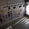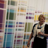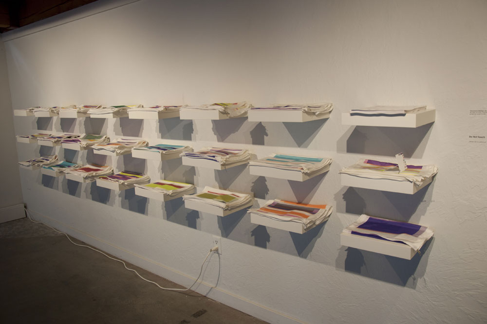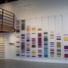 First are prototypes made for the 2011 University of Washington commission Chromosome 17 and the piece created for the Portland Art Museum, Case Study. Both works use the National Center for Biotechnical Information (NCBI) database of the human genome as a resource to artistically map scientifically derived gene sequences. The second work, DNA Microarray, located on the balcony, is formed from several large silk panels imprinted with the image of a DNA microarray. A microarray is a set of tiny DNA “spots”: small chunks of DNA sequences known as “probes” that fasten to a glass or silicon chip. The probes identify target sequences of DNA, which are easily seen via fluorescence or chemiluminescence as red, yellow, green, and blue dots that glow like a grid of stars in the night sky.