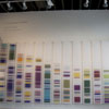 The origins of the word ‘chromosome’ comes from Greek khroma (“color”) + soma (“body”)’ These panels, literally made up of different color combinations, physically manifest the “color bodies” (or chromosomes). Chromosome paintings as representations of scientific data are optically stunning and will generate dialogues about vibrancy, complements, contrasts, and tonal ranges of the color combinations, which parallel genetic variance, anomalies, and similarities. The technique of chromosome painting, also known as “fluorescence in situ hybridization,” can detect chromosomal abnormalities like translocations and structural alterations associated with various diseases. For example, chromosome 19 carries a gene implicated in leukemia. With these disease associations in mind, each panel is labeled with a type of cancer correlated with a genetic marker present on the chromosome.