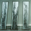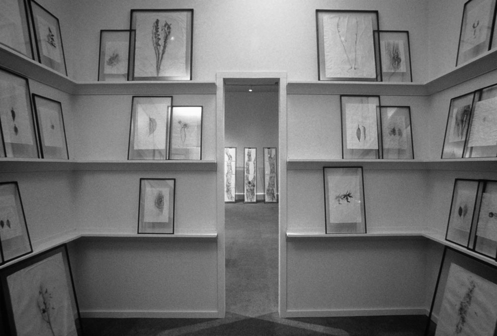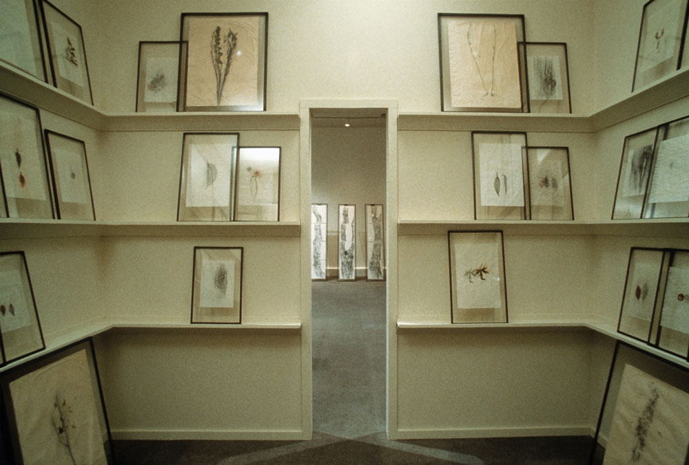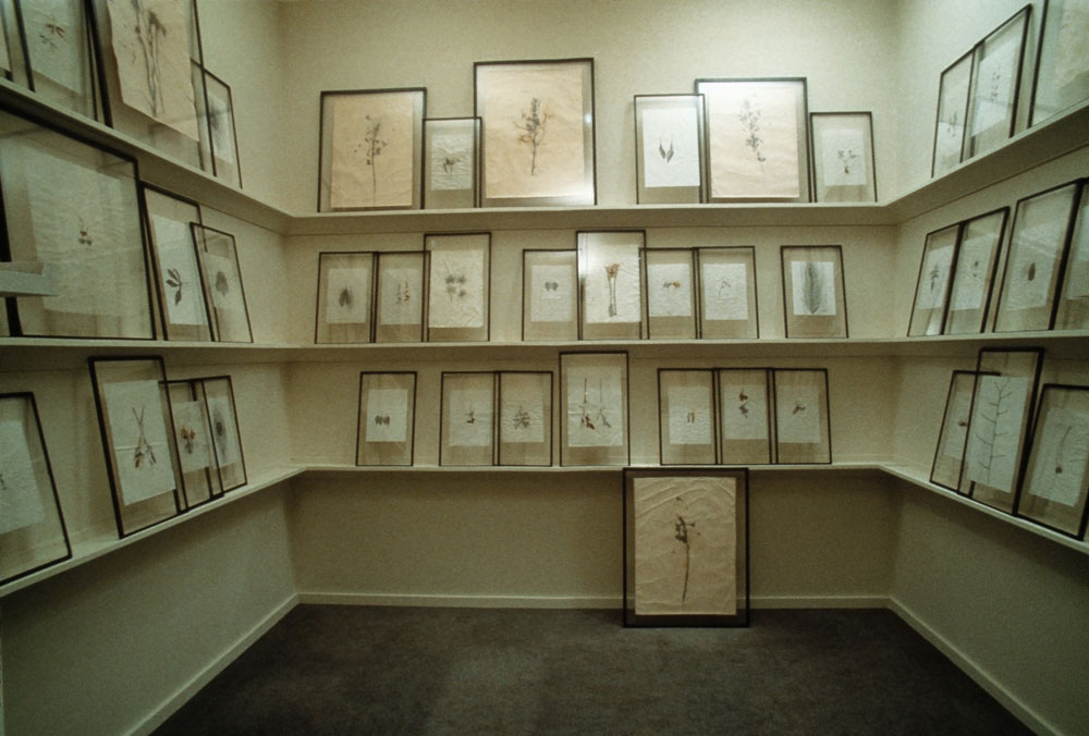 Libri is a library of organic forms and their ghost images. Formally this work references an herbarium, a structure created to organize and preserve the temporal. In this exhibition, both the image of the destroyed object and the object itself are preserved and rendered museographic.