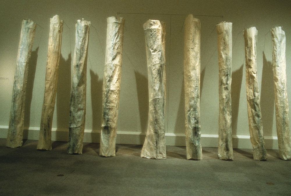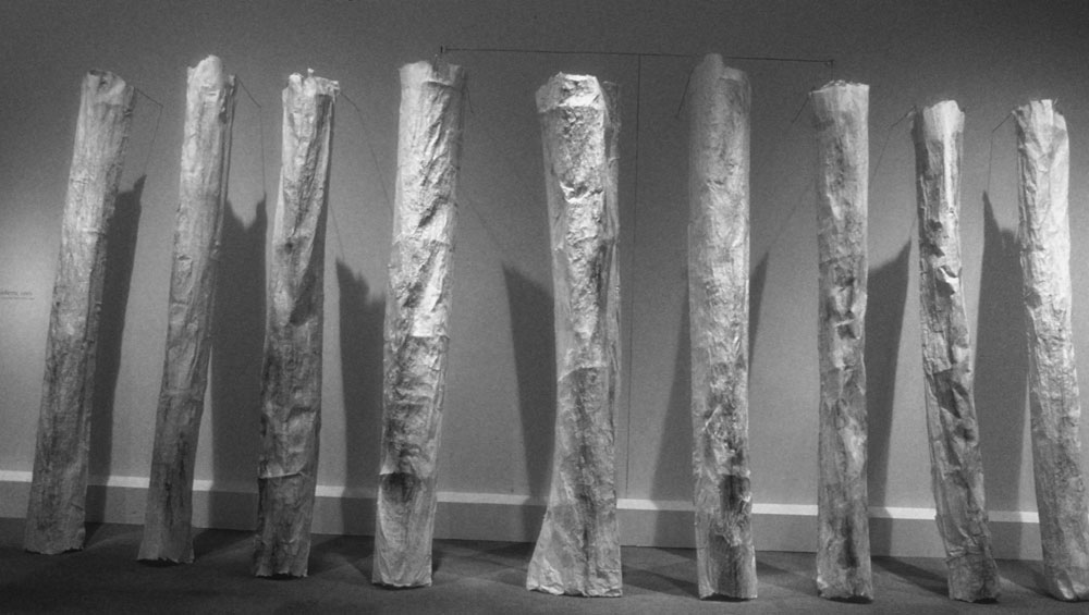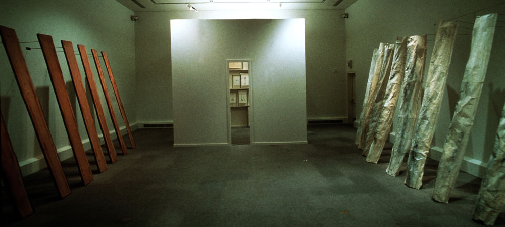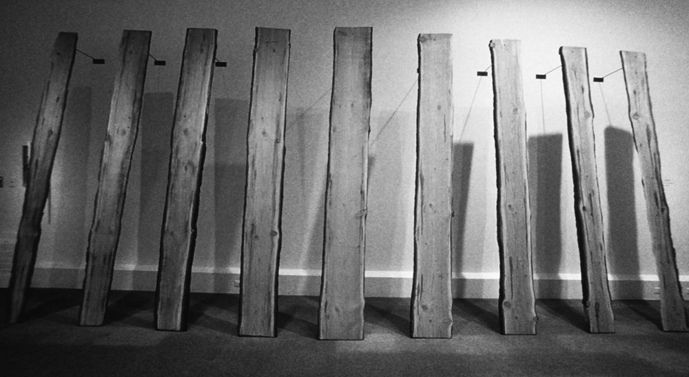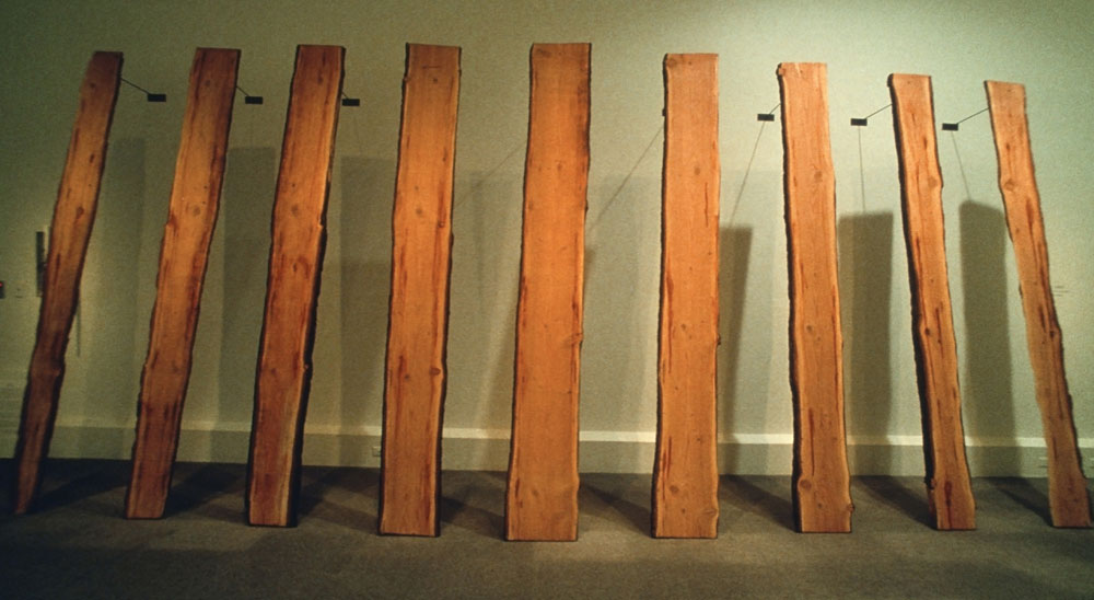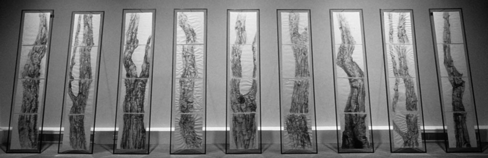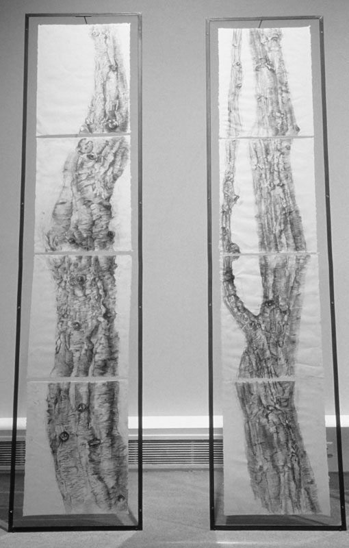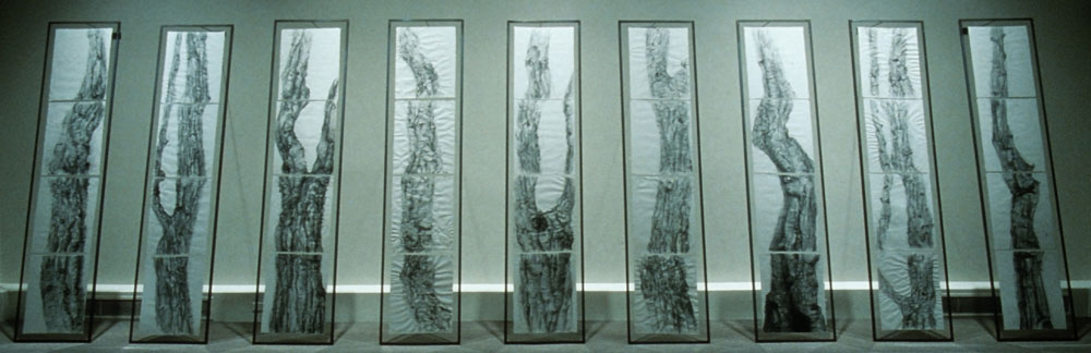 To accurately record the organic originals in this collection, the renderings were generated from rubbings of living plants. Paper casts were made of a felled fir tree and the planks result from milling the fir tree after the skins were cast. These rubbings are stains of the organic form. The casts are recordings of impressions of the living thing. Unlike taking a photograph, making a rubbing or a casting is to touch the object rather than merely to view it. Recording these objects by taking their direct impressions was done to preserve them before they decayed. Placing the original organic form in direct relationship to the image calls attention to its inevitable disappearance.