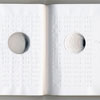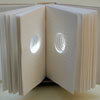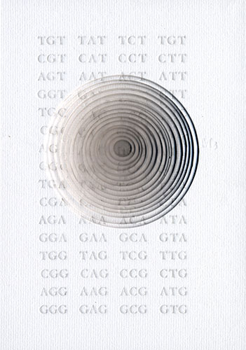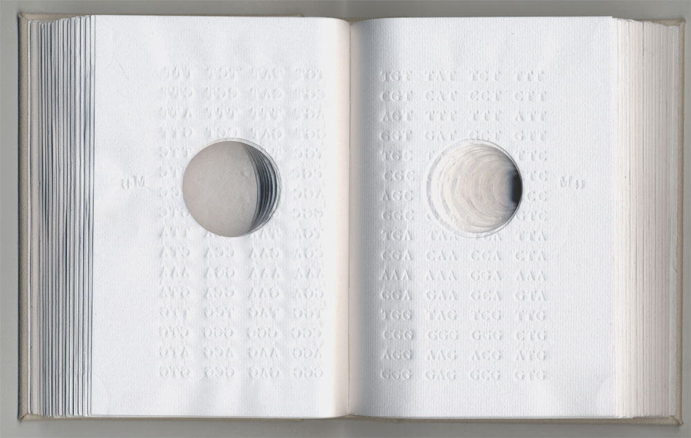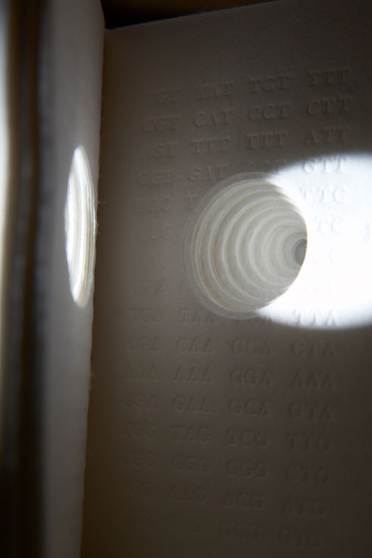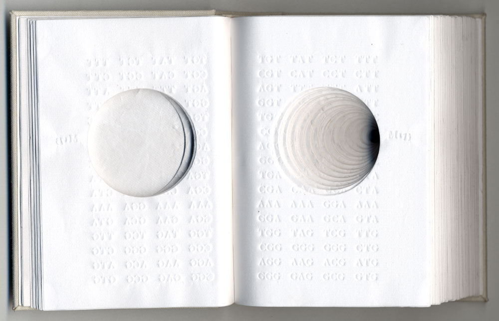 4 books letterpress-embossed in Garamond 10-point type with the Standard Genetic Code, TCAG 3 x 5 in. each paper: I. vellum, II. Hoshu, III. Arches Cover, IV. rice paper die-cut with consecutive circles ranging from 2 in. to 1/8 in.