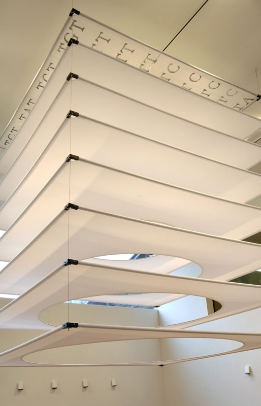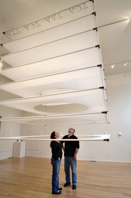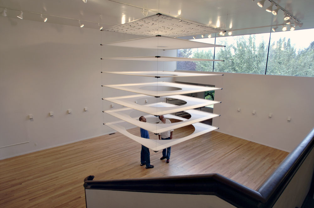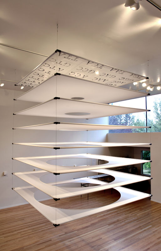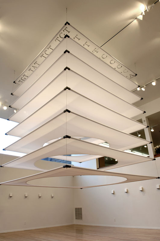 The eight 10’ x 10’ muslin panels that occupy the center of the gallery create a phenomenological space. They are hung 5’ off the ground so that the viewer can enter the center opening of the circular form. The first of the eight layers has a 7’ diameter circle and each corresponding circle is one foot smaller. The last circle is 1’ in diameter. The white-on-white muslin lets through a soft filtered light. The standard genetic code is printed on the top layer of silk with the letters TACG and filters through the entire work. In the direct center is a layer of silk printed with M168, the chromosomal marker for the Bush people. The entire piece creates an empty space for the viewers to occupy; it is a space for contemplation.