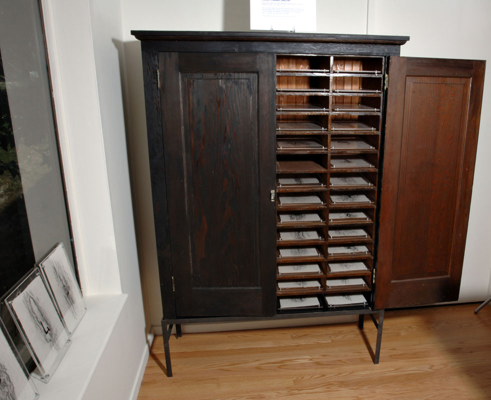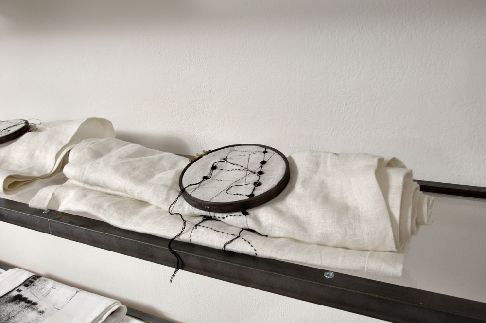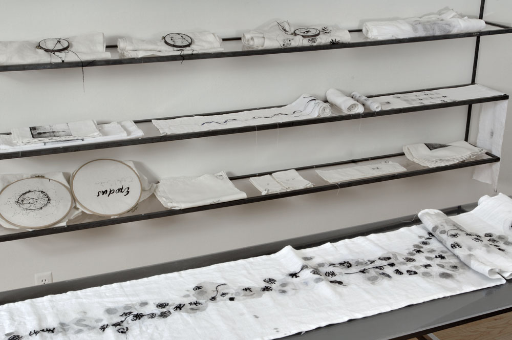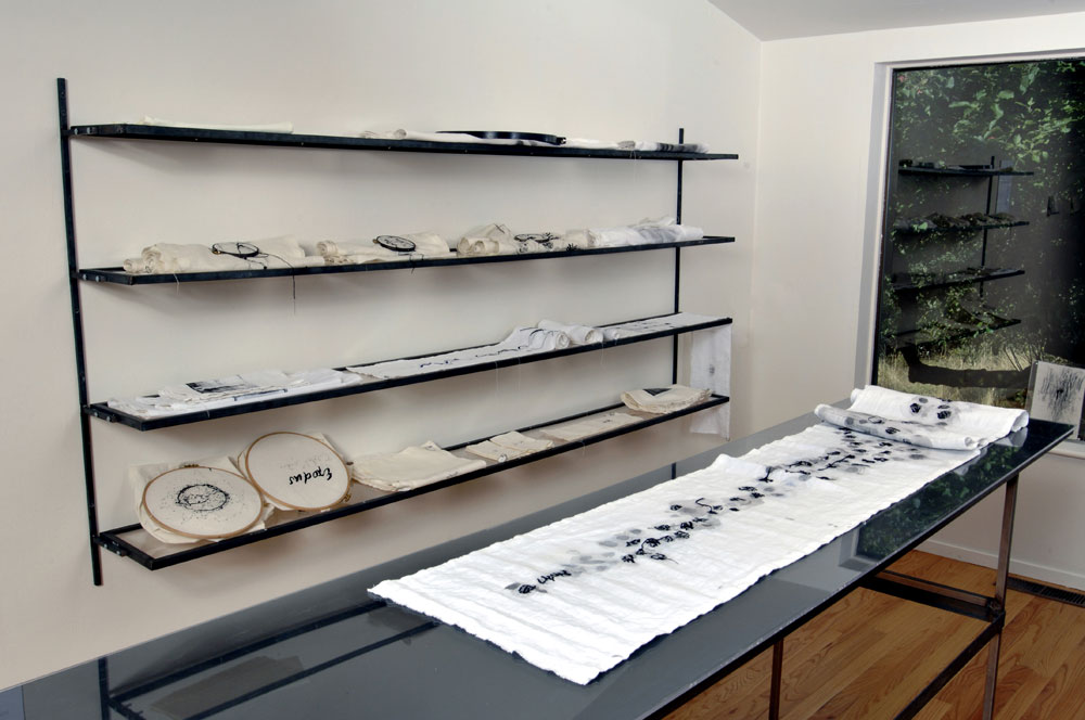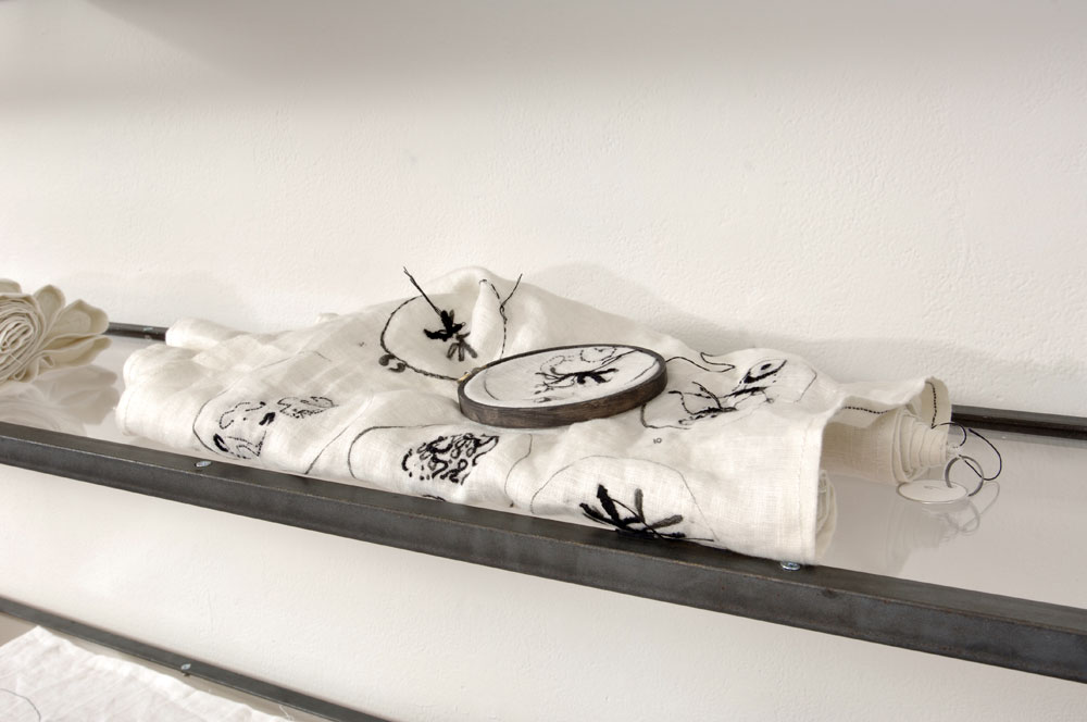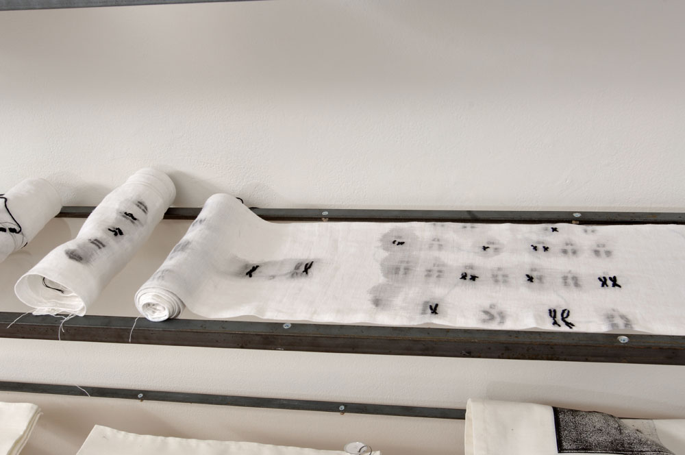 Since 2002, I have made numerous embroideries on linen, which reference the history of domestic textiles, and decorative embroidery. I have embellished these textiles with genetic or cellular images, which document chromosomes or cell divisions. In the installation the shelves and table hold over 60 pieces in various sets. Several of the linens are based on Palestinian dress panels. Torah Binders, while other are dinner napkins, table runners and placements.
