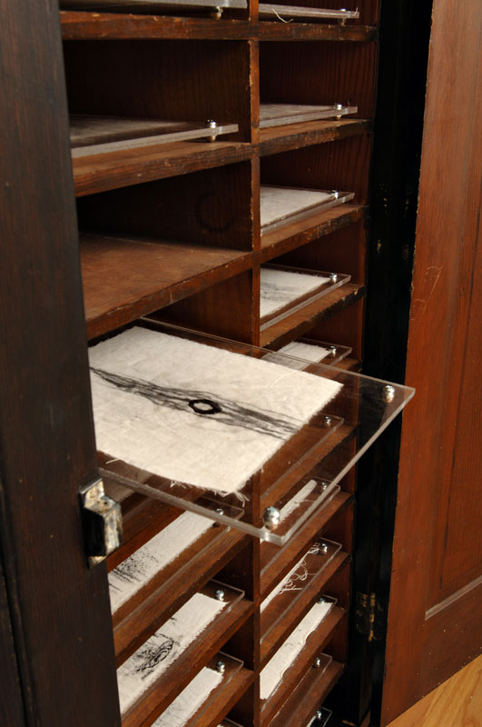 M168: Tracing the Y Chromosome is a physical metaphor for the lineage that all humans hold in their genetic structure. The installation consists of large muslin circular spaces, linens and books that are both metaphorical and literal maps of the migration of man’s DNA, from Africa to the Americas, over millions of years.