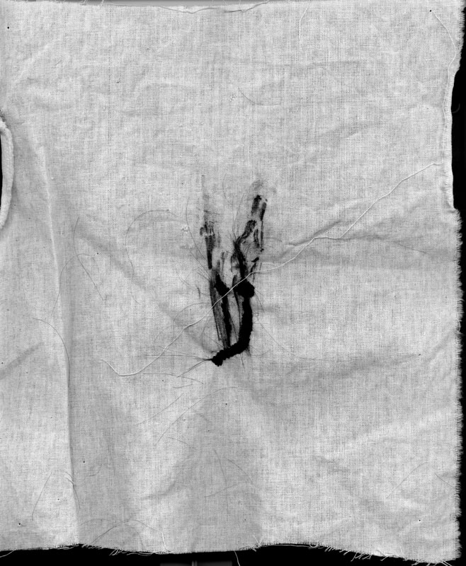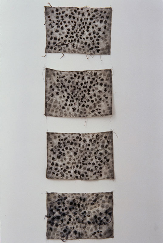 The dress panel form relates to the Palestinian tradition of embroidering symbols relating to the woman’s family and village on the front of a dress. Most often these very elaborate panels reference the fertility and longevity of a women and her family. For this dress panel, I accessed photographs of actively dividing fetal cells in various stages of meiosis and mitosis. Each panel was printed from the same photo made with an electron microscope. The photo was reproduced using a photographic palmer plate on a Reprex® Letterpress on linen.