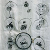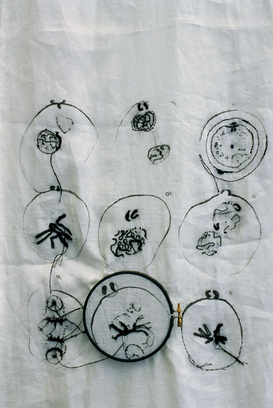 The images used for this work are the first known drawings documenting fertilization, cleavage and the process of mitosis and meiosis sequentially. These images are from Edouard Van Beneden’s paper published in 1883 titled, “Fertilization and Cleavage of the Ascaris Egg”. The image is embroidered on a 10’ linen table runner (see images on pp). For a full description of the works see pages.