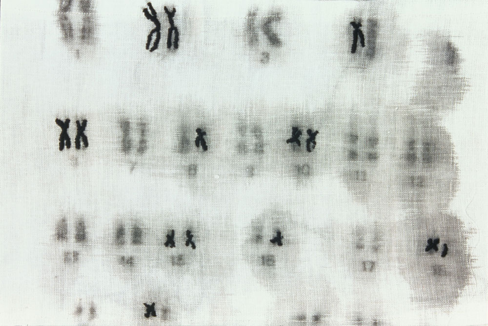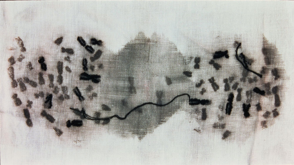 Three of the pieces are based on a Torah Binder, specifically those made by the Ashkenazi Jews living in rural southern Germany from the 15th century until 1932. These binders were traditionally made from the circumcision diaper to document a boy’s life. A man’s birth, religious rituals, marriage, and death would be recorded in embroidery by his mother and later his wife. The chromosome tests used for these works were made from my own amniocentesis test (done at the 5th month of pregnancy). This test shows healthy chromosome pairs and indicates the sex of the child; in this case it is a boy, my son.