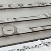 All 16 3” x 5” books in this exhibition are unique hand bound letterpress embossed works based on the Y chromosome genetic markers. One set of four books is letterpress embossed with the “Table of Standard Genetic Code”. The second set of four has the “Standard Code “with the anomalies that identify each racial group. Both sets have a funneling hole cut into the center, taking out the core of information. The chromosomal marker number is letterpress printed at the right side of the whole, beginning with M3, or Native Americans, and ending with M168, the Bush people. These books trace the markers on the Y chromosomes from the last migration of first peoples 10,000 year ago to the origins of humans 40,000 years ago.