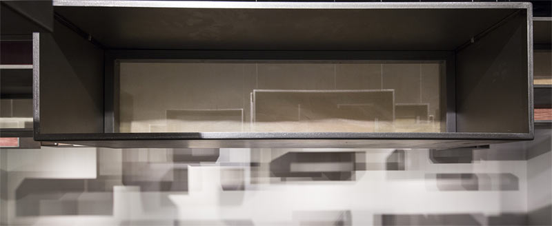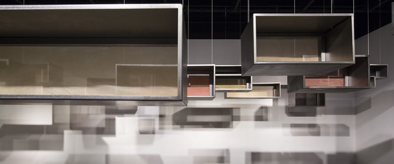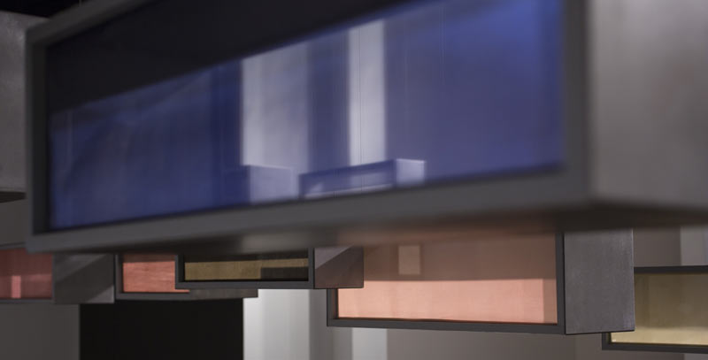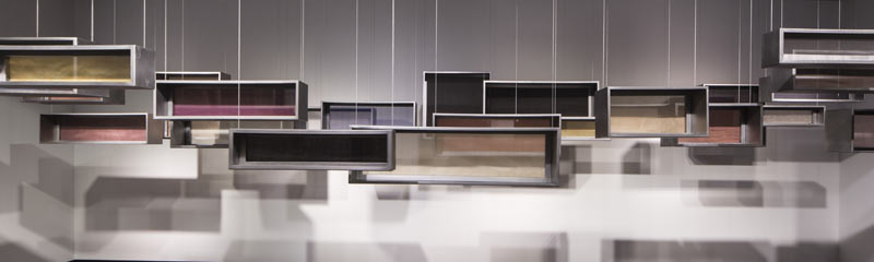 Working with the architecture of the Artist Project Space at the Jordan Schnitzer Museum of Art, I designed twenty-four thin steel boxes of various sizes to encase the different shades of silk. As a whole the piece looks like a matrix of grids. As one looks through the layers of steel boxes reflecting the silk colors and moves deeper into the space, one experiences a blending and buildup of tones or pigmentation. In mixing the chemistry for the dyes and timing the silk dying, I made sure that no two pieces of silk are the same, just as no two people are the same.