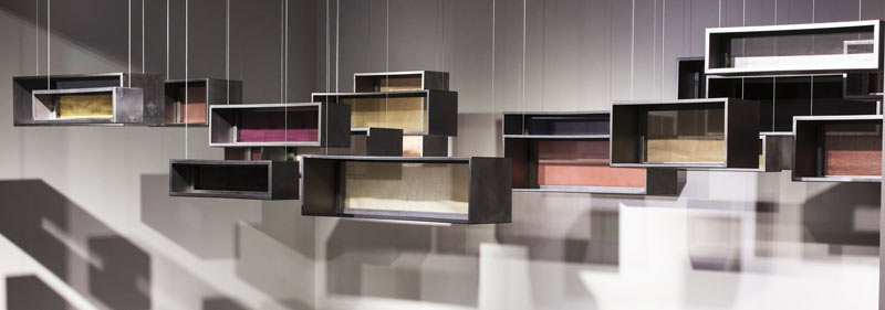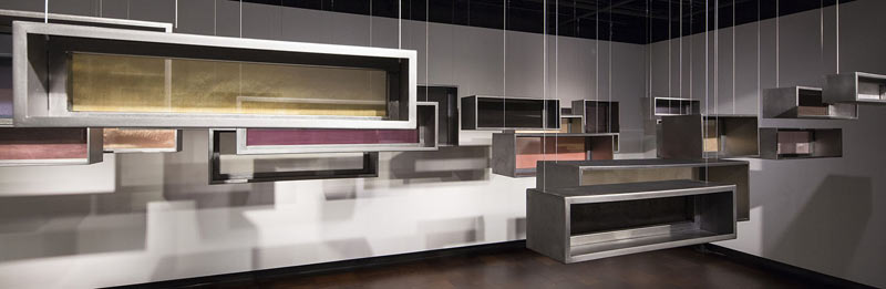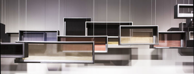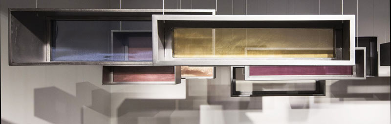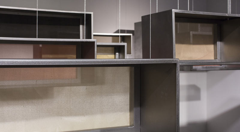32 Steel Boxes with Silk Panels Boxes. Boxes range from 4” x 20” to 10” x 30” Mild steel, 18-gauge, bent, welded, buffed and coated with matte finish; 100% silk from Uzbekistan and China, natural dyes.