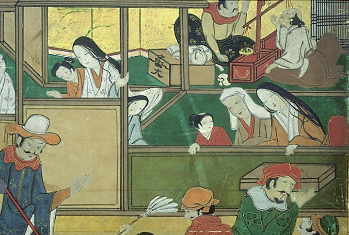 Color Plate 5. Detail from screen B, panel 2, showing convention for representing figures in interior space; note base of standing, folded screen in background. (photo author)
