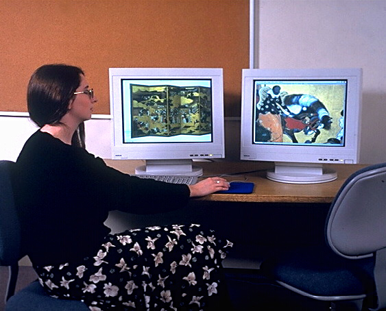 Figure 1. Computer workstation in the Art History Conference Room at Reed College, with side-by-side 21 inch monitors; student Rachel Perkins comparing overall view and detail of Japanese screen. Photograph by Fred Wilson.