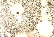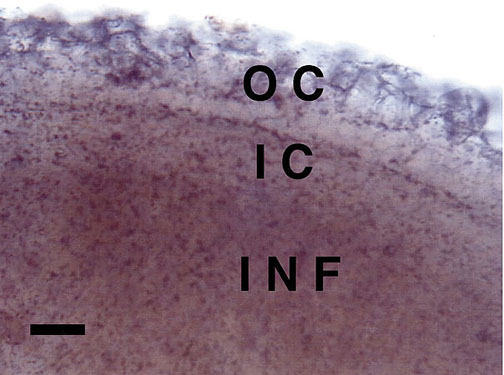 Figure 8. Histochemical localization of ascorbate (an important antioxidant) in alfalfa nodules. Silver particles precipitated from AgNO3 indicating the presence of ascorbate in high levels in the endodermis region of the cortex. (INF: infected region, IC: inner cortex, OC: outer cortex)