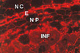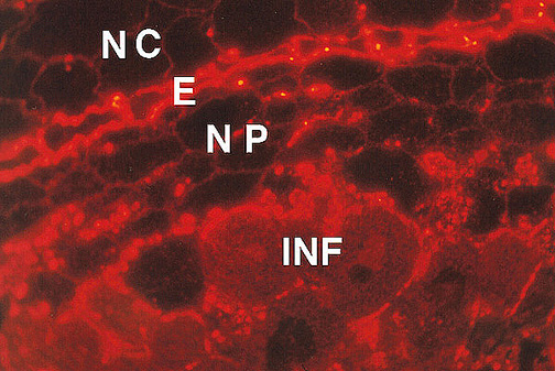 Figure 7. Cross section of nitrogen-fixing root nodule from alfalfa (Medicago sativa) with red Cy3 immunofluorescent probe indicating high concentrations of the antioxidant enzyme ascorbate peroxidase in the central infected region (INF) and in the endodermis (E). Other abbreviations: NC, nodule cortex; NP, nodule parenchyma.