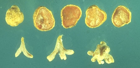 Figure 1. Close-up view of nodules of soybean (top) and alfalfa. The soybean