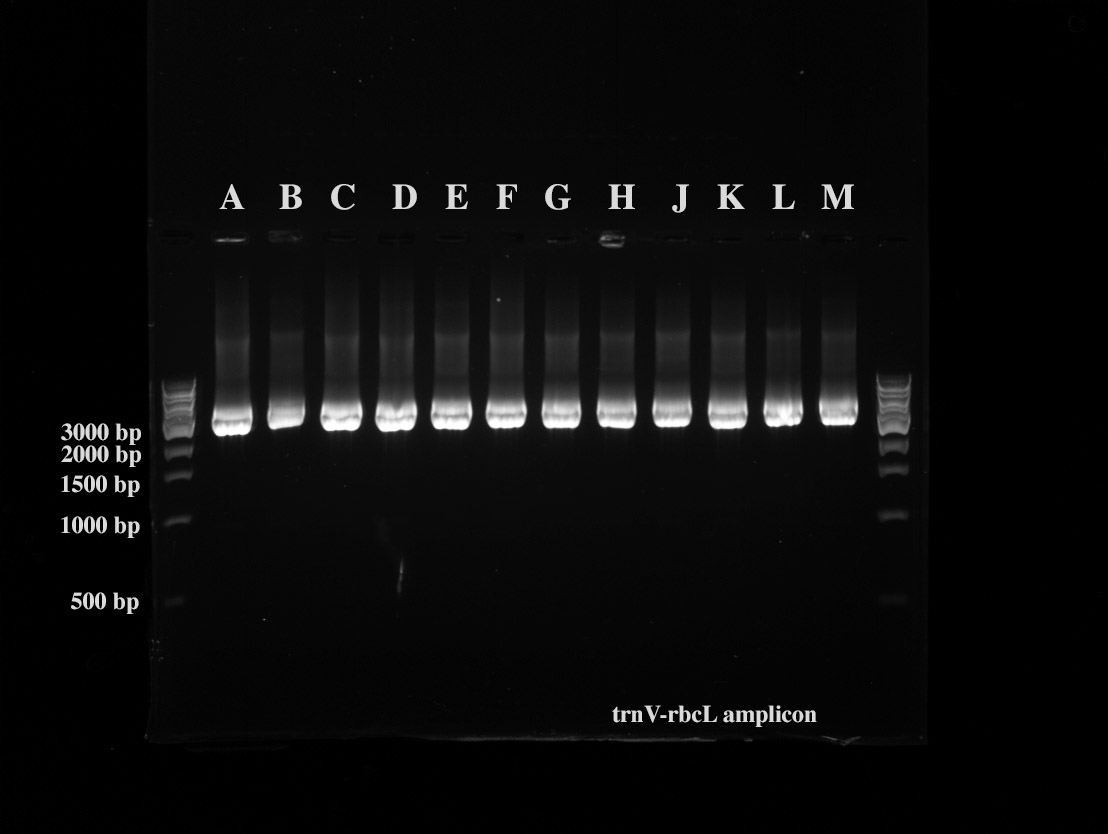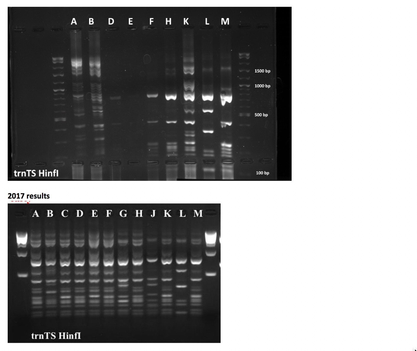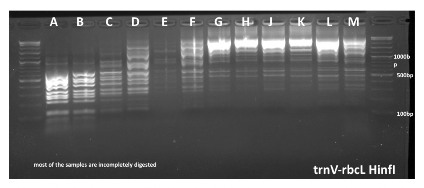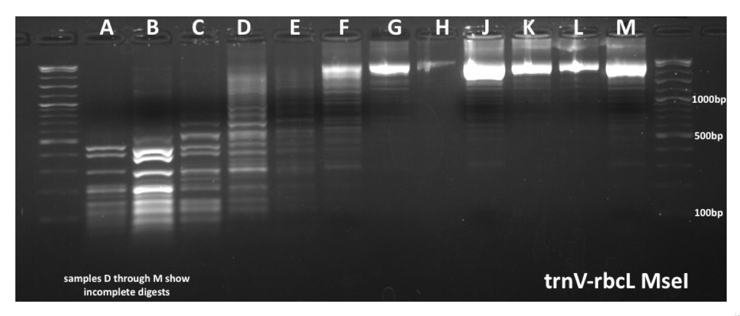 All digests below include ladders in the left and/or right lanes. Samples should be arranged alphabetically from left to right (A toH, J to M).