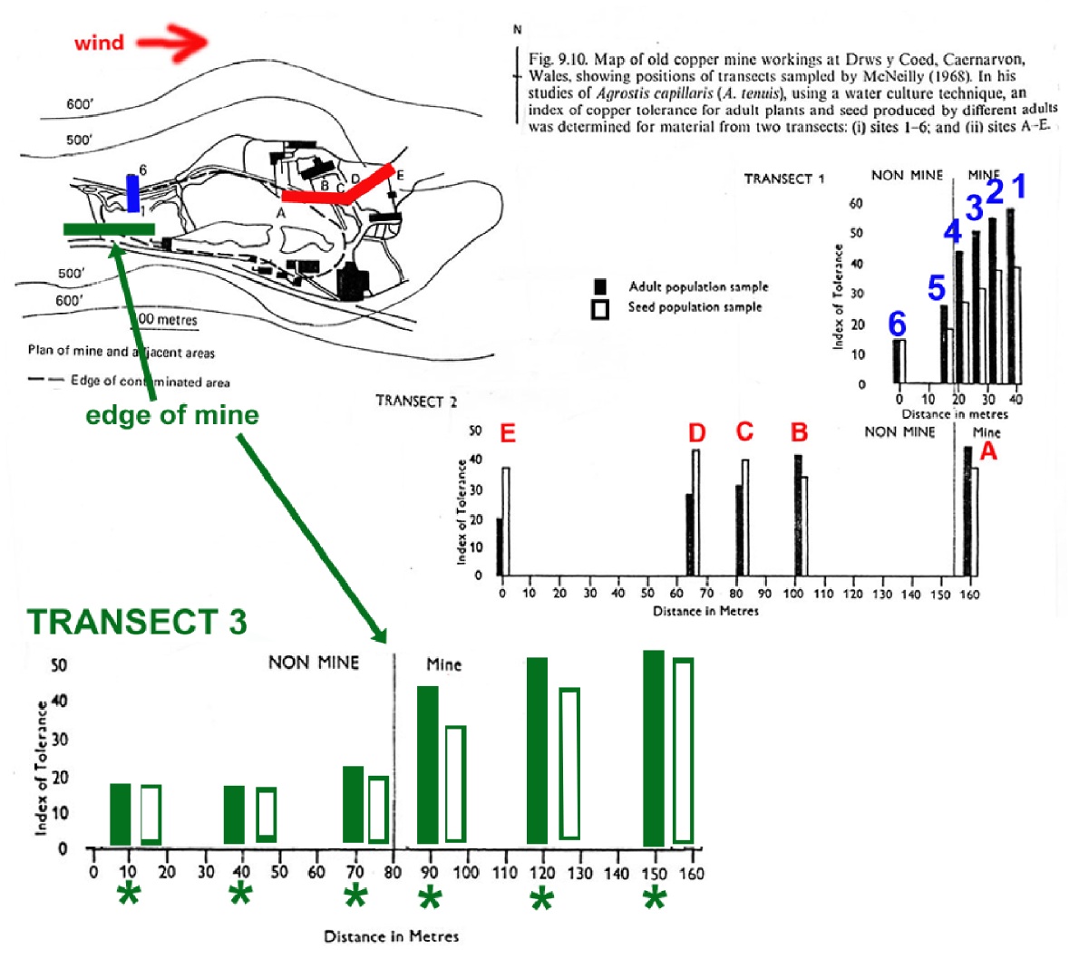 A third transect (the green line) has been added to the map, beginning in the meadow off the mine and continues onto the mine. The transition between the meadow and mine occurs midway along this transect (indicated by the green arrow). As before, adults and offspring are collected from positions along this transect (indicated by the six asterisks on the figure at the bottom).