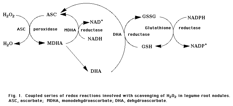 My primary interests are in biological nitrogen fixation and oxygen toxicity. Nitrogen-fixing plants (such as soybean, alfalfa, and alder) convert atmospheric nitrogen into ammonia and ultimately protein so they are partly self-fertilizing. However, this ability does not come without risks since nitrogen-fixing systems are very susceptible to damage from active forms of oxygen such as superoxide and hydrogen peroxide. My students and I have been examining various aspects of the defenses against active oxygen in nitrogen-fixing legume root nodules. We have concentrated on the role of the ascorbate-glutathione pathway which has 4 enzymes.