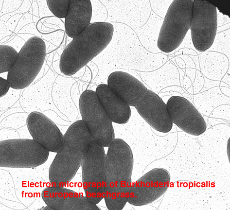 My lab has also uncovered a novel system of nitrogen fixation in European beachgrass (Ammophila arenaria). We have observed that this grass harbors nitrogen-fixing bacteria living within the cell walls of stems and rhizomes, making this the first known case of endophytic nitrogen fixation by any temperate grass species. We have isolated the bacterium responsible for nitrogen fixation (Burkholderia tropicalis) and are in the process of further characterizing this system using a wide range molecular, biochemical, and ecological approaches. See photomicrograph below.