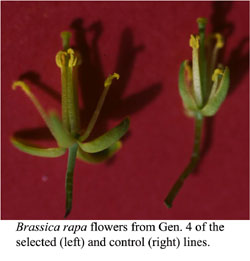 One goal of this collaborative project is to learn the evolutionary explanation for the long-term stasis of a trait that is diagnostic for the Mustard family -- tetradynamous stamens (four stamens with long filaments and two stamens with short filaments). In my Bio 332 course at Reed, we have used artificial selection on plants of the rapid-cycling Brassica rapa lines to demonstrate that the filament length dimorphism that is diagnostic for species in the Musatrd family can be readily altered by selection (see Figure at left; Karoly and Conner, 2000). A similar selection experiment was undertaken in collaboration with the Conner lab using Raphanus raphanistrum. In summer 2002, we placed the divergent lines in field arrays exposed to natural pollination ecology to be able to estimate the strength and direction of natural selection on the filament dimorphism (in a related question, we investigated selection on anther exsertion in summer 2001 - photos from the field). We are currently using genetic markers to determine pollen success for plants from field experiments in 2001 and 2002. This research has been supported by a grant from the Nattional Science Foundation Division of Environment Biology.
