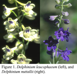 Diversification of Northwest Larkspur. Northwest species in the genus Delphinium appear to be a recently diverged group. Our studies have focused on determining the pattern and causes of diversification for two closely related species, Delphinium nuttallii and Delphinium leucophaeum. Flower color is the primary trait that distinguishes the two taxa, and D. leucophaeum has a very limited distribution and is State-listed endangered in Oregon.