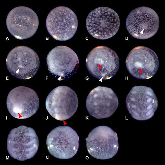 I–L, Migration of caudal bud and consolidation of germ band. Inversion begins: germ band splits into left and right halves. Appendage buds visible.