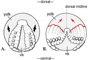 B, At the end of inversion, cells from the outside edges (red) end up at the dorsal midline.