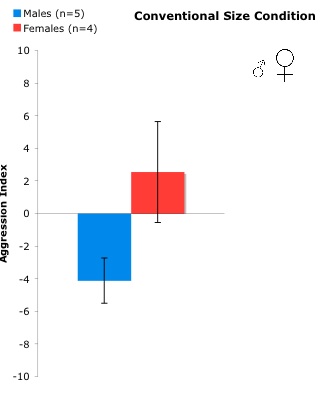 The aim of this investigation was to examine possible sex-role reversal from the perspective of social interactions between males and females. I set up different treatments with different size combinations of males and females and recorded the levels of aggression of each individual.