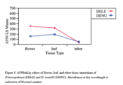 Differences in flower color between two recently diverged plant species, Dephinium leucophaeum and Delphinium nuttallii, are caused by differing expression of flavonols and anthocyanins within their floral tissue. Anthocyanins and flavonols also function as antioxidants within plant tissues, absorbing reactive oxygen species generated when plants are under stressful conditions, such as drought, flooding, and temperature extremes. If different levels of anthocyanins and flavonols are expressed in non-floral tissues between the two species, it may cause a difference in the ability of the two species to cope with environmental stress. It had been observed that D. leucophaeum was generally found in flooded conditions while D. nuttallii was not, and it was hypothesized that a pleiotropic effect may be causing the tubers of D. leucophaeum to express high levels of flavonols just as in the species' floral tissue. This would in turn lead to geographic isolation and explain the mechanism behind their speciation. In this study, floral, leaf, and tuber tissue of D. leucophaeum and D. nuttallii were examined for differences in anthocyanin and flavonol expression through the use of pigment analysis. It was found that flavonol levels in D. leucophaeum leaves and flowers were significantly higher than those in D. nuttallii. Flavonol levels in tubers of both species were found to be significantly lower than leaves and flowers of either species, and no difference in flavonol level between the two species' tubers was observed. It was also found that the leaves of D. leucophaeum were richer in anthocyanins than D. nuttallii leaves. No significant difference was observed in the flower or tuber tissue between species. An attempt was made to measure the antioxidant capacities of the different tissues using the oxygen radical absorbance capacity (ORAC) assay, which was performed on a real-time qPCR machine. The use of the assay for this urpose was ultimately unsuccessful. The low levels of flavonols and anthocyanins found present in the tuber tissue by the pigment assay makes the initial hypothesis of tuber flavonol levels impacting flooding resistance seem unlikely.