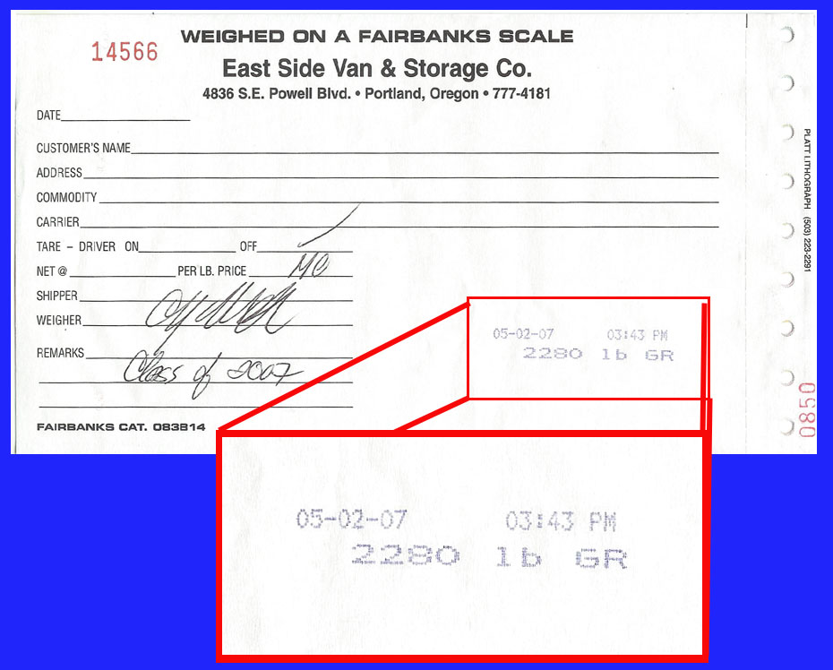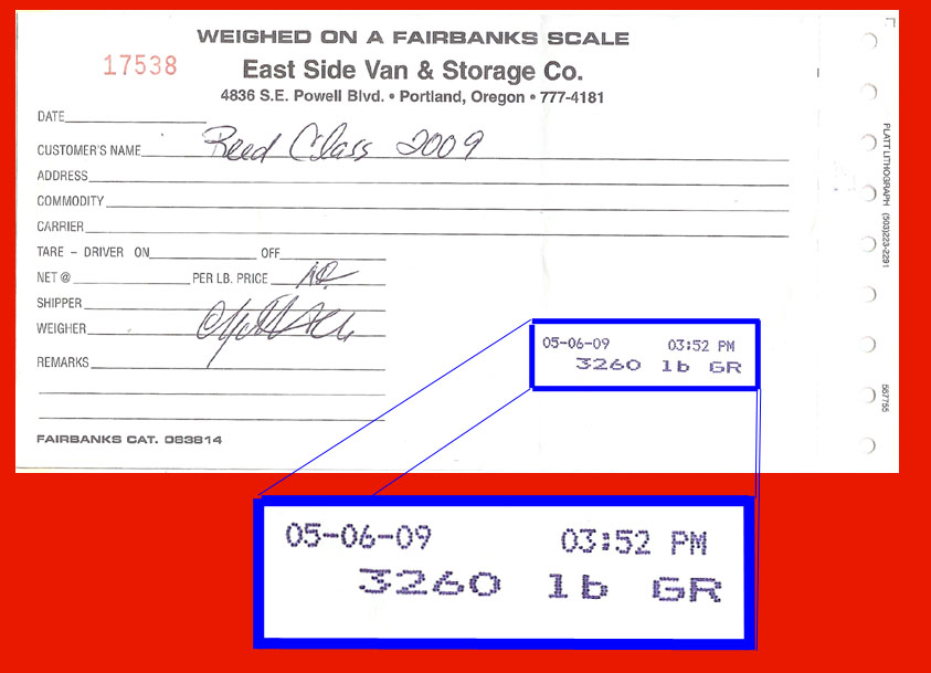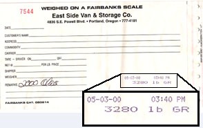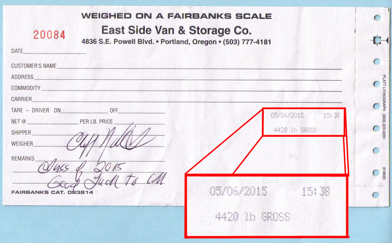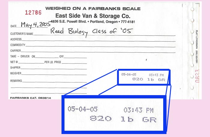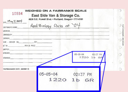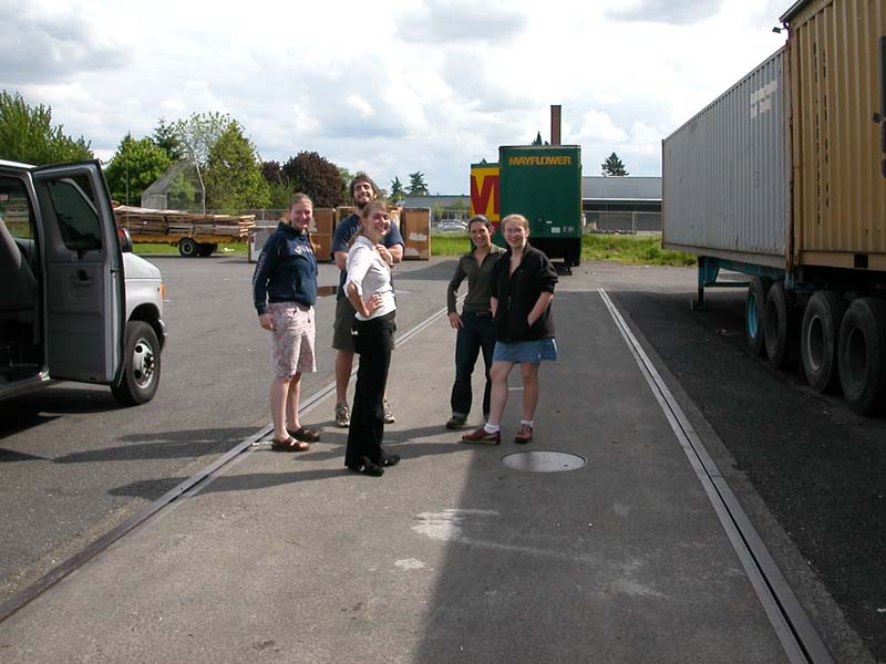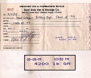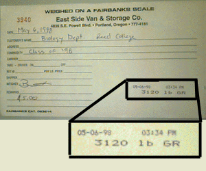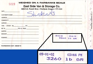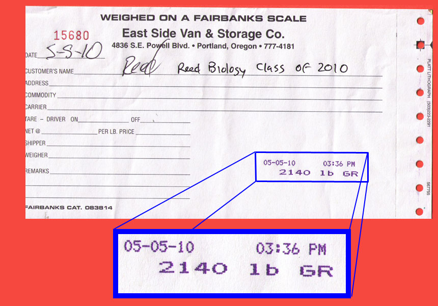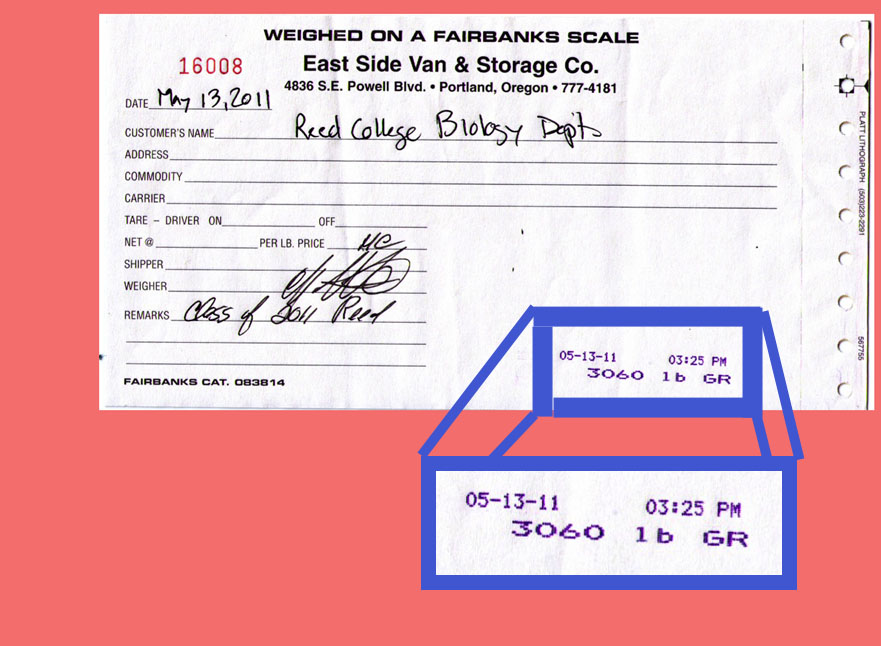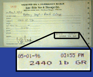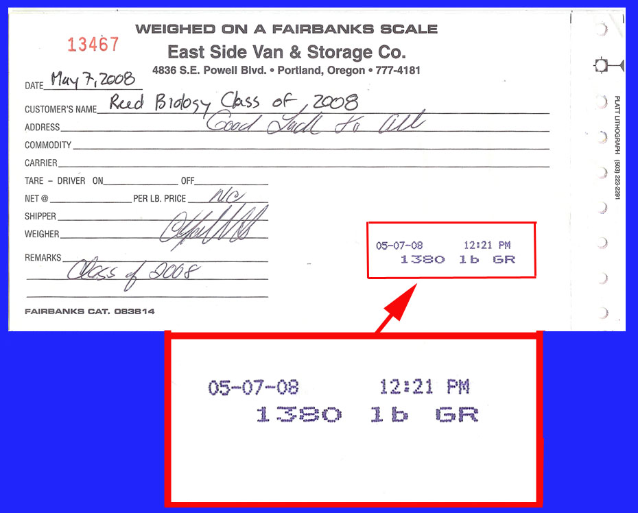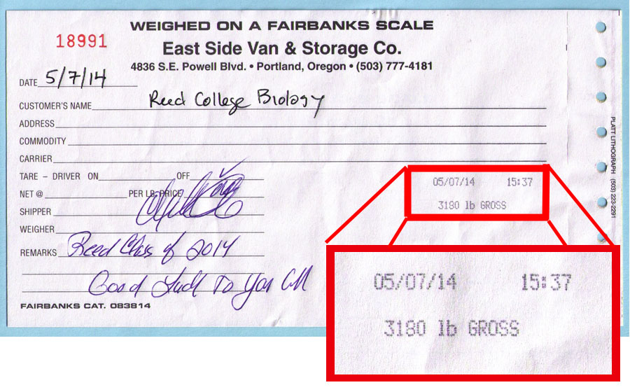 The seniors are transported en masse to a public scale. For the first 20 years, BIOMASS was determined on the Fairbanks Scale at the East Side Van & Storage Company (4836 SE Powell - a big THANKS! to Cliff and the folks at Eastside Van & Storage for their good humor and professional help with our data collection). In 2017, the BIOMASS determination was moved to Recology near SE Foster and 101st.