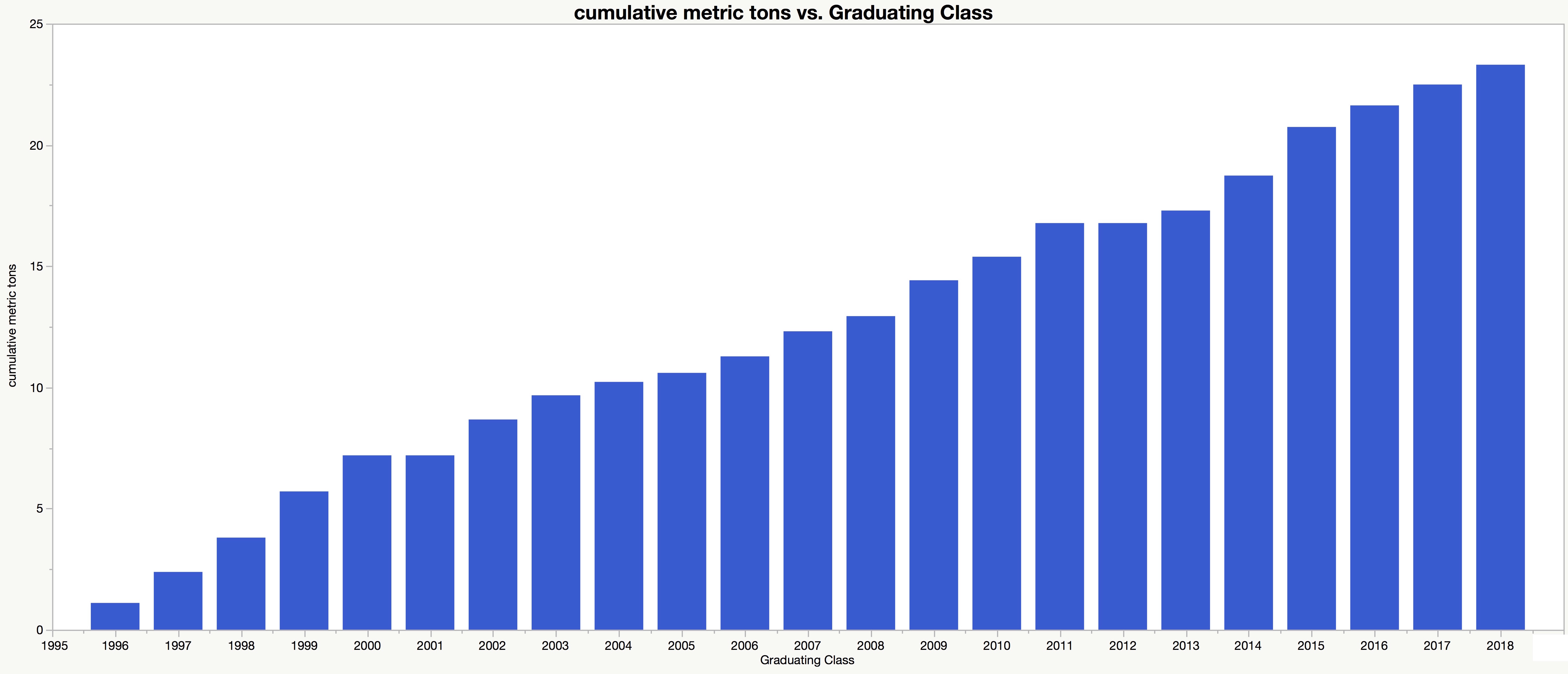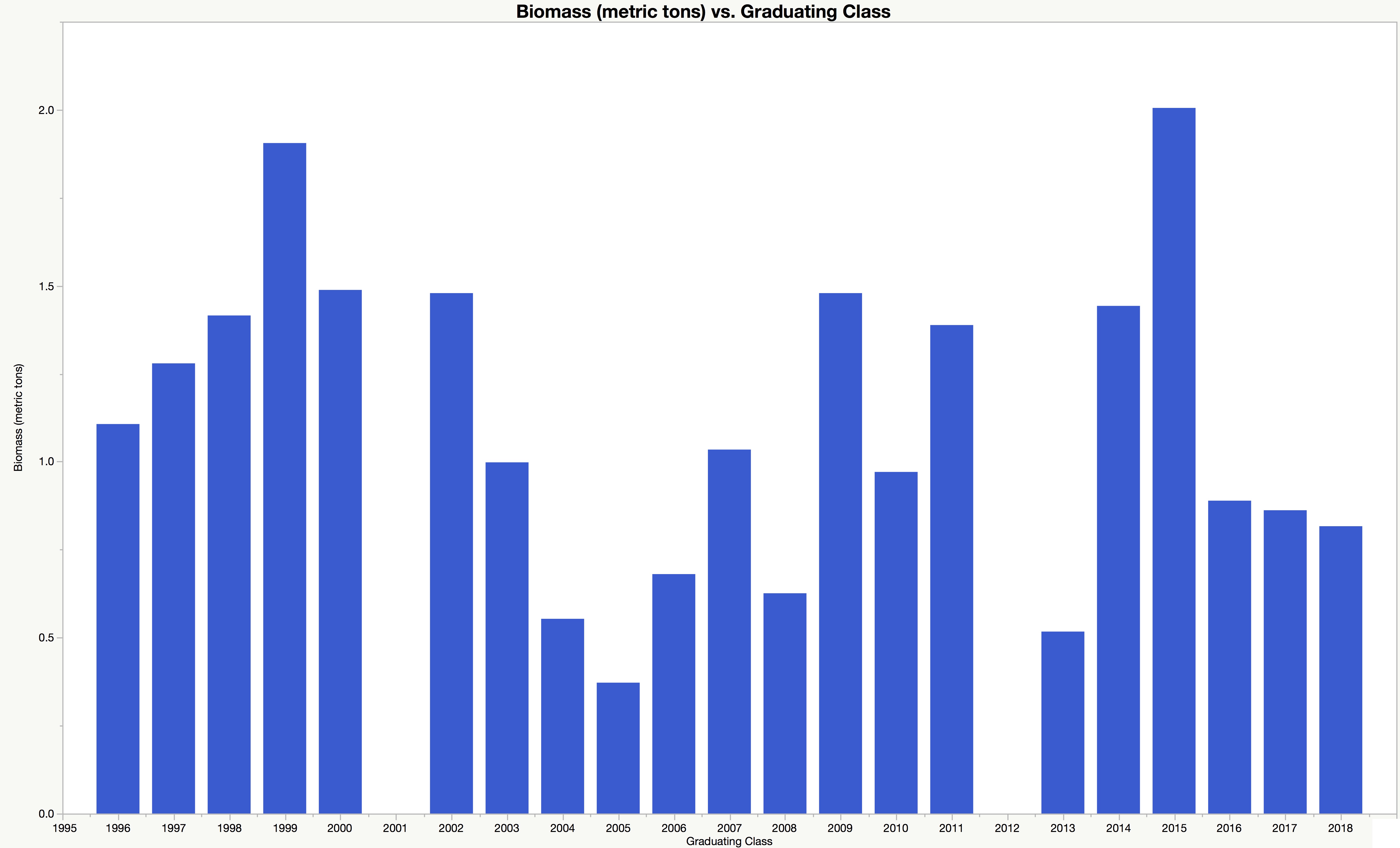 Results from the first four years (Figure 1 below) show a remarkable increase, which some attribute to El Nino. The lack of data collection for year 2001 is likely a result of the Biology Buiilding renovation (was anyone there? who can remember?) . In 2015, the CUMULATIVE BIOMASS surpassed the 20-metric-ton mark (Figure 2 below) .