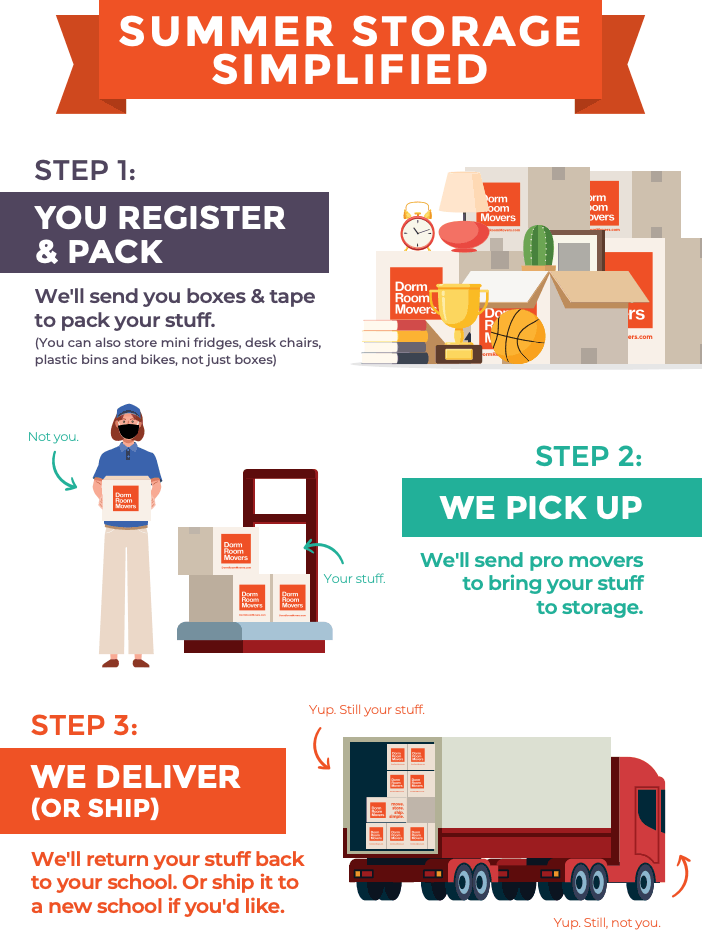 Dorm Room Movers will be on campus May 14 - 16, May 19, and the morning of May 20 to pick up items that you’d like stored. All storage guidelines, prices and what can and cannot be stored are listed on their website. Students must register themselves with Dorm Room Movers and select a pick up time, which can be done here. DRM will then mail the student boxes and packing supplies for their items - which the student must pack up themselves. An insured DRM mover will meet students outside of their Residence Hall at their scheduled pick up time to collect the items being stored.