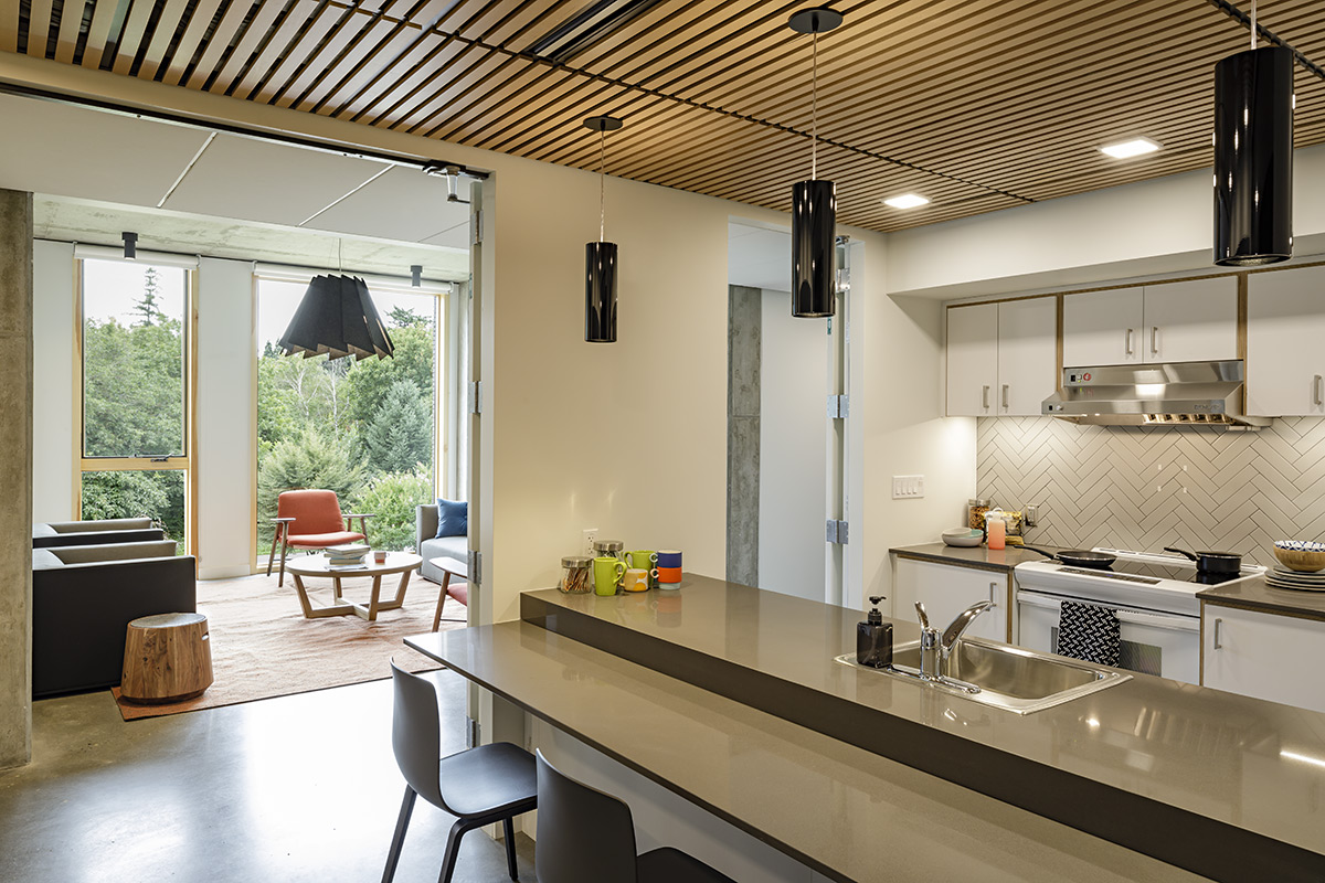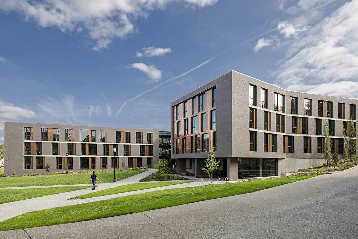 Trillium, which opened in 2019, is located on the north side of campus and has views of Portland’s west hills and the Reed College canyon (depending on which way you look!). This modern building is made up of three separate wings and connected by a common core. Each wing, with approximately 20 students, has a kitchen, a common room, and several nooks and crannies for personal or small-group use. The first floor houses the building’s laundry room, the second floor is home to a large common room, and the fourth floor has a TV lounge and a balcony. Trillium is a LEED (Leadership in Energy and Environmental Design) Platinum certified building.