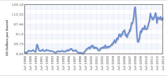 The dollar oil price from 1988 to 2013 is shown below (source):