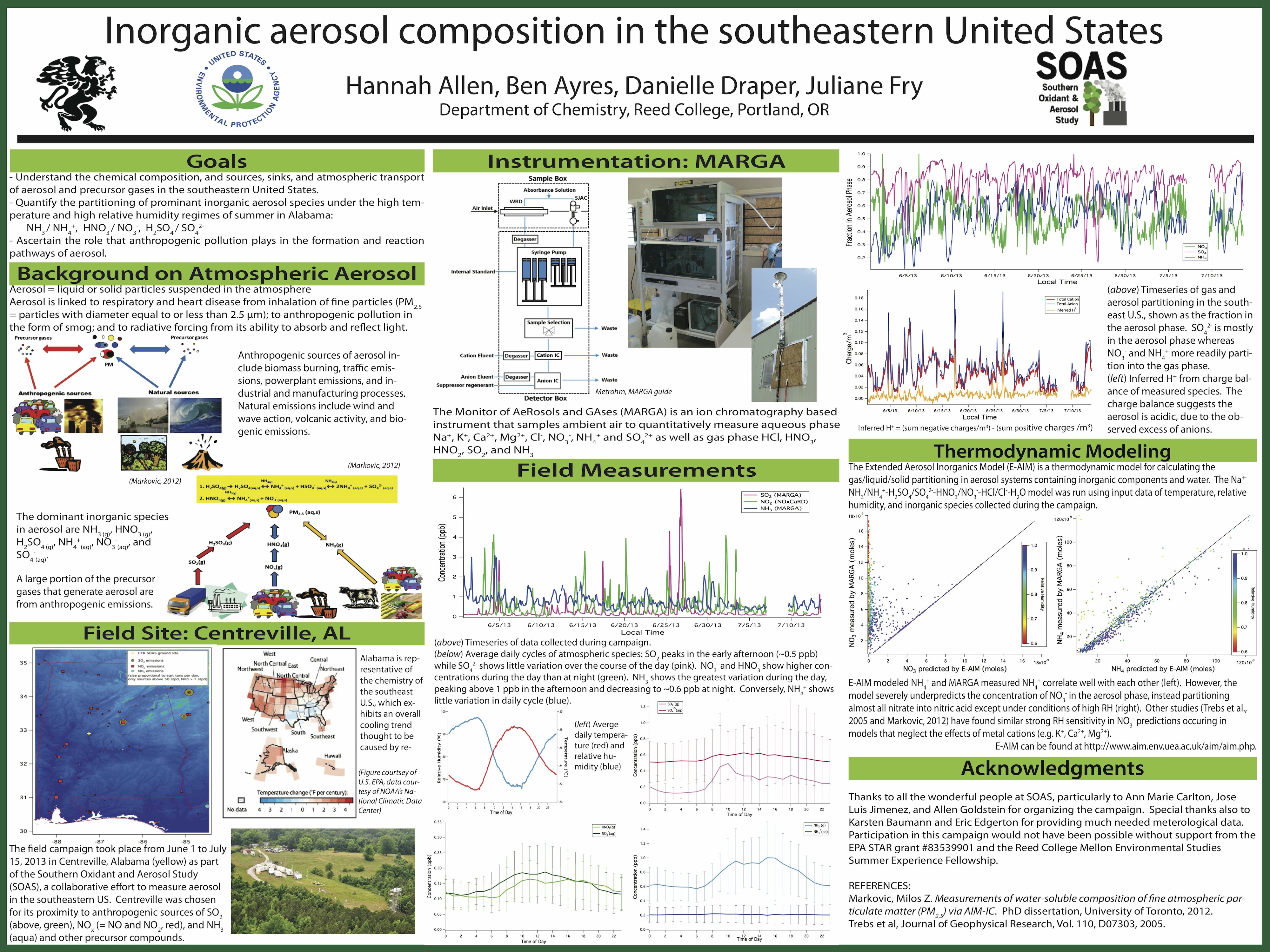 Project Summary: Over the summer I travelled to Centerville, Alabama with Prof. Julie Fry to participate in the Southern Oxidant and Aerosol Study (SOAS) field campaign. In Alabama, I used the Monitor for AeRosols and GAses (MARGA) ion chromatography system to gather measurements on the inorganic composition of gases and aerosol in the atmosphere, with the goal of understanding how aerosol contributes to regional climate change in the southeastern United States.