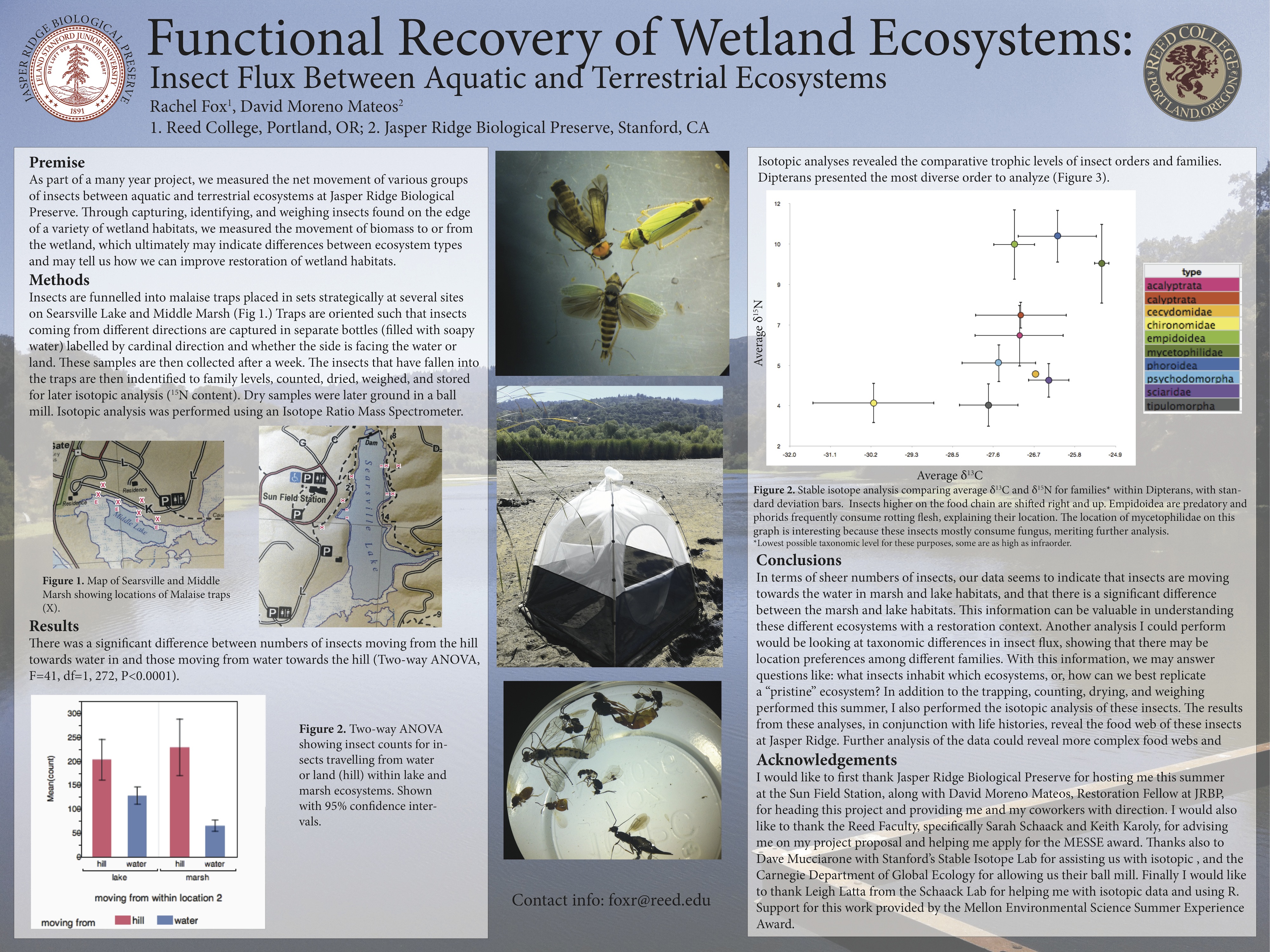 Project Summary: As part of a many year project, we measured the net movement of various groups of insects between aquatic and terrestrial ecosystems at Jasper Ridge Biological Preserve. Through capturing, identifying, and weighing insects found on the edge of a variety of wetland habitats, we measured the movement of biomass to or from the wetland, which ultimately may indicate differences between ecosystem types and may tell us how we can improve restoration of wetland habitats.
