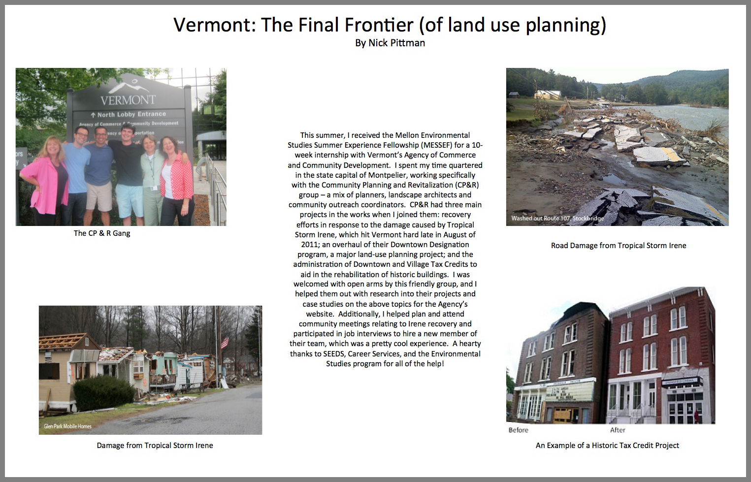 Summer 2012 MESSE: Nick Pittman, "Internship with Vermont’s Agency of Commerce and Community Development, focused on studying the recovery of towns and businesses following Tropical Storm Irene."