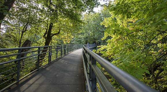 The unusual design of this bridge, the only one of its kind in the world, was the result of more than a year's research by the architect and a plywood company. The bridge was supported by two cantilevers of pre-stressed plywood and covered with a thin canvas membrane, which was eventually determined to be too slippery. The current bridge, built in 1992, won the coveted "Excellence in Concrete" award from the American Concrete and Aggregate Producers Association.