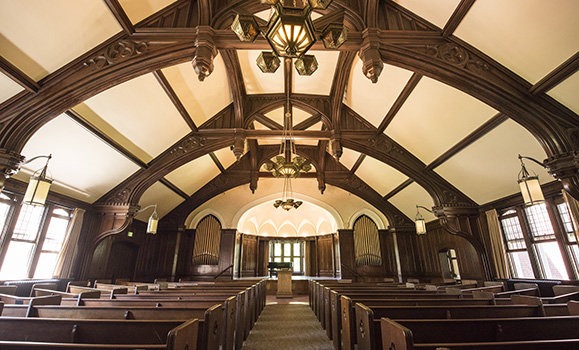 The chapel architecture borrows details that date back to the 10th century. The stairway leading up the chapel features Elizabethan-era patterns. Named the "Staircase of Emulation," the walls of oak paneling were originally intended as a space for hanging commemorative placques. Restoration work in the chapel has maintained the architect's original color choices for the stucco and fabrics, and for the finish on the wooden beams, carved chairs, and pulpit.