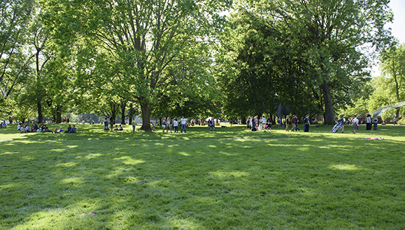 The Front Lawn, or Great Lawn, is the large grassy area in front of Old Dorm Block and Eliot Hall.