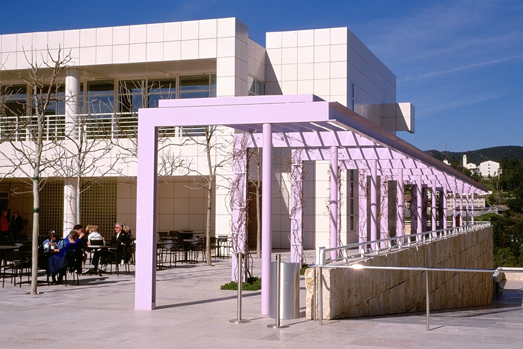 upper-level terrace with violet arbor, fire turck ramp at right |