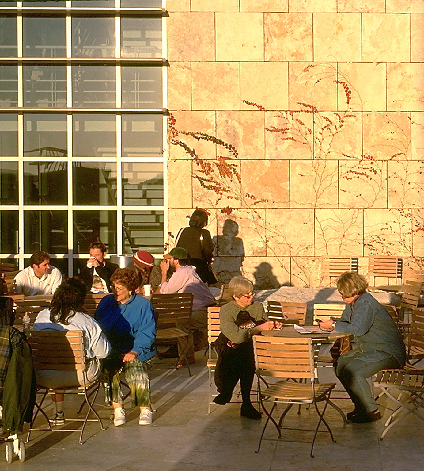 east pavilion wall with recently planted Boston ivy, late afternoon sun |