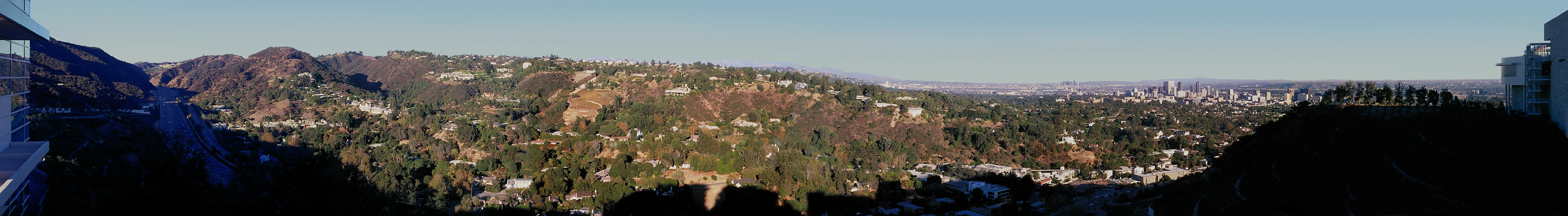 panorama looking north to southeast, to the Sepulveda Pass, Bel Air, downtown Los Angeles and Century City, from the Getty Conservation Institute Nov. 1997 |