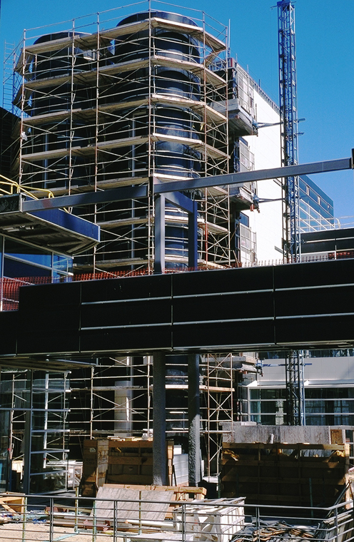 elevator silos and bridge to East Building entry kiosk during construction |