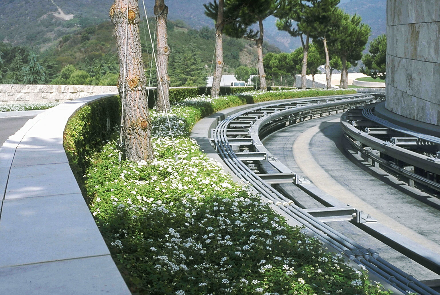 vine trimmed along top of wall, ground cover in narrow space between wall and tramway |