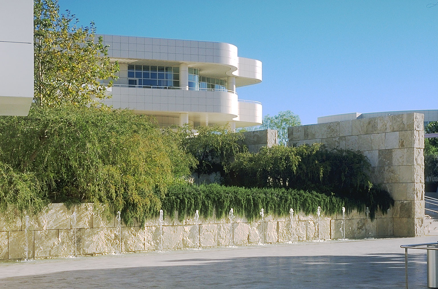 mixed plantings on stepped levels above fountain, southeast corner of arrival plaza |