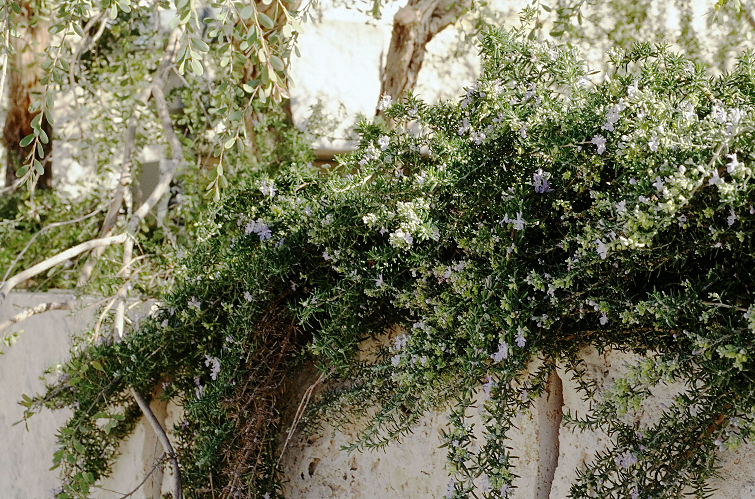 Rosemary cascading over wall behind fountain |